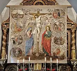 Der um 1640 gefertigte, frühbarocke Hochaltar mit Nischen zwischen gedrehten, kannelierten und mit Knorpelwerk besetzten Säulen, einem ebensolchen Aufsatz und Knorpelwerk geschmückten Opfergangstüren birgt im Hauptgeschoß die Figuren der heiligen Florian, Stephanus und Sebastian sowie im Aufsatz eine Verkündigungsgruppe, flankiert von den Heiligen Barbara und Margaretha. Das um 1720/1730 geschnitzte Relief des Antependiums zeigt die Steinigung des heiligen Stephanus. Die Kirche besitzt ein 1612 entstandenes Fastentuch des Zentral-Typs mit acht um eine zentrale Kreuzigungsgruppe angeordneten Passionsszenen in Rundmedaillons.