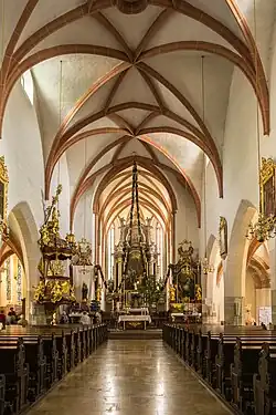 Der gotische Hochchor mit seinem vierjochigen Kreuzrippengewölbe und 5/8-Schluss datiert aus der ersten Hälfte des 14. Jahrhunderts und stand durch seine Höhe zunächst in markantem Gegensatz zu den Flachdecken der Langhausschiffe. Diese wurden schließlich nach einem Brand in der Zeit zwischen 1496 und 1513 unter der Leitung des Ratsherrn Martin Gerstenecker (Grabstein unter dem Westportal) mit Kreuzrippengewölbe ausgestattet, jedoch auch im Mittelschiff nicht die Höhe des Chors erreichend.