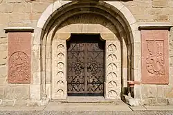 Insbesondere an der Südseite sind romanische Charakteristika in der Form von Halbsäulen mit würfelförmigen Kapitellen sowie der abgetreppte Rundbogenfries erhalten. Die Nordseite war größeren Veränderungen unterworfen, Bestand hat jedoch noch das romanische Nordportal aus der zweiten Hälfte des 12. Jahrhunderts (wenn auch in einer barocken Vorhalle). Die Portalsäulen sind durch besondere Kapitelle ausgezeichnet, links ein Adler und rechts Blätter und Fische.