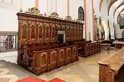 Das um 1750 geschaffene Rokoko-Chorgestühl wurde 1790 aus dem ebenfalls aufgehobenen Kartäuser-Kloster Gaming übertragen. Es erwies sich zunächst als zu groß, musste daher einer Adaptierung unterzogen werden und erhielt schließlich 1861 eine zusätzliche vordere Sitzreihe.