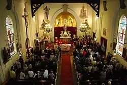 Auf der linken Seite befindet sich ein monumentales Kruzifix als Nachbildung des Kreuzes in der Wallfahrtskirche Limpias (in der Landschaft Santander, Spanien) – dies wohl im Sinne eines Gnadenbilds, das die Kirche zu einer Wallfahrtskirche machen sollte. In Limpias soll sich zwischen 1919 und 1920 das hölzerne Kruzifix in den leibhaftigen Jesus Christus verwandelt und bewegt haben.[1]