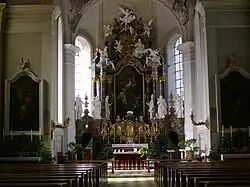 Der bemerkenswerte Hochaltar um 1770 hat einen Rokoko-Aufbau mit einem hohen Sockelgeschoß mit seitlichen Opfergangsportalen, der Altar hat je drei übereckgestellte Säulen, geschweiftes Gebälk, im Auszug die hl. Eucharistie im Strahlenkranz mit einem darüber befindlichen Baldachin. Der Hochaltar zeigt das Altarblatt hl. Erasmus mit der Gottesmutter gemalt von Martin Knoller 1772 und trägt Statuen von Johann Perger.