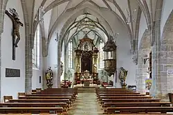 Die Kirche hat ein einschiffiges und fünfjochiges Langhaus. Darüber ist gegenständiges Netzrippengewölbe. Der Chor ist 2½ Joche lang und endet im 3/8-Schluss. Die Westempore ist dreiachsig und ein Mal gebrochen. Die Empore lagert auf Netz- und Sternrippengewölbe. In der 2½-jochigen südlich gelegenen Kapelle ist Netzrippengewölbe.