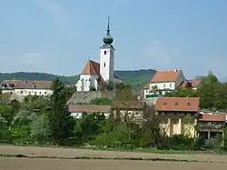 Urkundlich wurde 1006 (?) eine Kirche genannt. Die spätgotische Saalkirche mit einem Nordturm um 1500 und einem westlichen Zubau einer Querhalle des Langhauses durch den Baumeister Bartholomäus Lukas 1660 ist von einer mächtigen mittelalterlichen Wehrmauer umgeben, dabei wurden Quadersteine aus der ehemaligen Burg vermauert. Der ehemalige Friedhof um die Kirche wurde im 19. Jahrhundert aufgelassen.