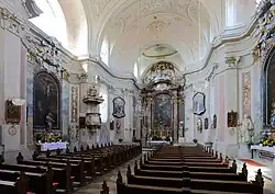 Über dem Gebälk sind je drei Rundbogenfenster, im Querteil Kartuschenfenster. Die Empore erhebt sich über niedrigen Wandpfeilern mit Platzlgewölben und hat eine vorschwingende kassettierte Brüstung und Rokokogitter.
