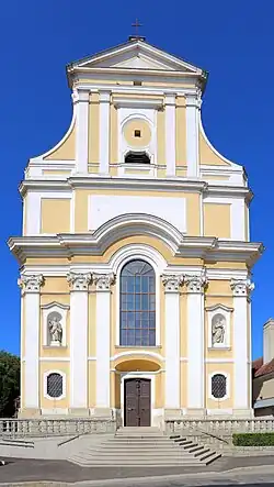 Der dreiachsigen Ostfassade mit hohen gekuppelten Riesenpilastern ist eine Freitreppe mit seitlicher Balustrade vorgelagert. Die Riesenpilaster werden von korinthischen Kapitellen abgeschlossen. Die zweigeschoßige Fassade ist übereck in den östlichen Langhausbereich gezogen. In den beiden Seitenachsen der Fassade befinden sich über Kartuschenfenstern mit Schmiedeeisengittern Nischen mit Figuren der Heiligen Petrus und Paulus.