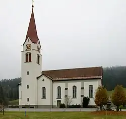 Die Kirche steht nördlich der Hauptstraße, etwas erhöht auf einem Berghang.