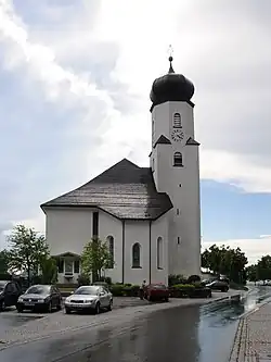 Der Chor und der Kirchturmsockel der spätgotischen Kirche und der Achteckaufbau mit rundbogigen Schallöffnungen und Zwiebelhelm aus dem Ende des 18. Jahrhunderts blieben erhalten. Der neue Kirchenbau wird durch je drei Halbkreisfenster an den Langhausseiten und zwei an der Westseite belichtet. Der breite Saalraum hat ein Walmdach, das sich nordöstlich bis an den Turm und über Chor und Sakristei nach fortsetzt. Die dreiachsige Westfassade mit dem Hauptportal ist durch Pilaster, Gebälk und Dreiecksgiebel gegliedert.