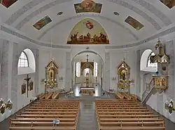 Die Deckengemälde stammen von Johann Kärle (1882): im Chor Triumph der Kirche, im Langhaus Bildfelder mit sieben Szenen aus dem Leben Christi, als typologischer Bezug zur Auferstehung, Jonas und Samson, seitlich sechs Brustbilder von Propheten und unter der Orgelempore Christus als Guter Hirte. Das Wandbild über dem Triumphbogen mit der Darstellung der Himmelfahrt Christi ist bezeichnet mit (Hans) Strobl 1950.