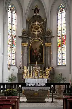 Der Hochaltar aus dem Jahr 1768 ist ein hoher, schmal proportionierter Altar aus Türnitzer Marmor mit übereck gestellten Pilastern und flankierenden Obelisken. Das Altarblatt zeigt den hl. Martin, 1808 geschaffen von Johann Josef Schindler. Der Auszug mit einem Strahlenkranz trägt die bekrönende Gruppe Dreifaltigkeit, der freistehende Altartisch trägt einen Tempietto-Tabernakel.