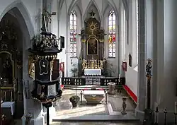 Der einjochige Chor hat einen Fünfachtelschluss sowie ein Kreuzrippengewölbe auf Halbkreis- und Konsoldiensten und im Westen auf Konsolen. Es gibt eine zweiteilige Sessionsnische in einer profilierten Rechteckrahmung aus dem Anfang des 16. Jahrhunderts. Das Sakristeiportal mit einer profilierten Rechteckrahmung hat eine blechbeschlagene Tür mit gekreuzten Bändern mit originalen Beschlägen aus dem 17. Jahrhundert. Die Sakristei hat ein Tonnengewölbe und darüber ein Oratorium mit einem Stichkappentonnengewölbe und zwei Oratoriumsfenstern in profilierten hölzernen Kreuzstockrahmen mit einer Bleiverglasung aus der ersten Hälfte des 19. Jahrhunderts. In der nordwestlichen Ecke der Sakristei befindet sich eine eingestellte Wendeltreppe.