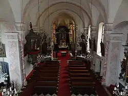 Das Kircheninnere zeigt ein einschiffiges fünfjochiges Langhaus unter einem Tonnengewölbe mit Stichkappen und Gurten auf halbrunden gotischen Wandvorlagen. Die Westempore ist dreiachsig. Nordseitig am dritten Joch befindet sich eine barocke quadratische Seitenkapelle mit Konche und Platzlgewölbe, gegenüber südseitig befindet sich eine Altarnische. Der hohe Triumphbogen ist spitzbogig. Der zweijochige Chor mit einem Fünfachtelschluss hat ein Stichkappengewölbe, die gotischen Rippen wurden abgeschlagen, die Kämpfergesimse sind wohl barock. Die gotischen Dienste auf teils figürlich geschmückten Konsolen sowie Kapitelle mit Köpfen, Blattwerk und Drachen entstanden im Anfang des 15. Jahrhunderts, zwei Konsolfigürchen zeigen wohl die Bildnisse der Baumeister Mertin und Jorans. Über der nordseitigen Sakristei befindet sich ein Oratorium. Die rechteckigen Fenster im Langhaus und Chor sind schmal.