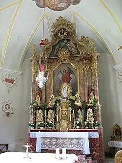 Der Hochaltar mit einer Rokoko-Ornamentik aus dem Ende des 18. Jahrhunderts zeigt das Altarbild hl. Michael von Josef Gold um 1880. Die zwei Seitenaltäre aus dem Ende des 17. Jahrhunderts tragen Nischenfiguren aus dem Ende des 19. Jahrhunderts. Der linke Seitenaltar zeigt Maria. Der rechte Seitenaltar zeigt Anna lehrt Maria das Lesen. Die Orgel aus 1909 stammt von Josef Sapl.