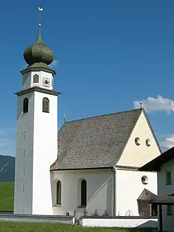 Der schlichte spätbarocke Kirchenbau mit einer Rundapsis ist von einem Friedhof umgeben. Der Nordturm mit einem achteckigen hölzernen Glockengeschoß trägt einen Zwiebelhelm. Südlich ist eine Sakristei angebaut. Das Westportal ist rundbogig.