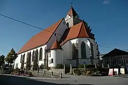 Das Langhaus im vorderen gotischen Bereich ist eine zweischiffige dreijochige Staffelhalle mit einem bemerkenswerten Netzrippengewölbe im Hauptschiff mit gekurvten Rippenstücken und drei unterschiedlichen Sternformationen im Südschiff. Der westliche zweijochige Anbau aus 1967 hat ein Obergeschoß als Empore. Der eingezogene einjochige Chor mit einem Fünfachtelschluss ist kreuzrippengewölbt. Der mächtige steinsichtige Turm steht nördlich an der romanischen Nordwand des Langhauses und an der gotischen ehemals tonnengewölbten Sakristei. Im südlichen Chorwinkel steht der Sakristeianbau aus 1926 über einem quadratischen Grundriss mit einem Treppentürmchen an der äußeren Ecke.