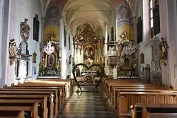 Der Hochaltar aus 1778 trägt Figuren von Franz Domiscus, das Altarblatt mit der Darstellung des Erzengels Michael ist aus der 2. Hälfte des 19. Jahrhunderts. Die dekorativen Seitenaltäre mit Vorhangmotiv sind aus 1778, die klassizistische Kanzel ist aus 1786. An den Wänden hängen zwölf lebensgroße Apostelbilder aus der 1. Hälfte des 18. Jahrhunderts. An der Orgelempore sind ein lunettenförmiges Steinrelief mit Darstellungen von Maria mit Kind, Christophorus und Erasmus (um 1525/1530) sowie eine Schmerzensmannfigur aus der Mitte des 18. Jahrhunderts zu sehen.