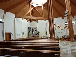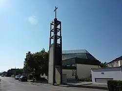 Der moderne Kirchenbau hat einen quadratischen Grundriss mit einer abgeschrägten Ecke mit schmalen Fensterbändern und einem diagonal angeordneten Walmdach umgeben von ein- und zweigeschoßigen Gebäuden des Seelsorgezentrums, durch offene überdachte Gänge miteinander verbunden. Der Glockenträger steht frei.
