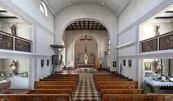 Das basilikale Langhaus wurde nach Norden erweitert, der neue Chor durchbricht südlich den gotischen Altbestand, Reste der gotischen Kirche sind quer gelagert erhalten, östlich der ehemalige Chor als Seitenkapelle, westlich das ehemalige Langhaus als Sakristei. Der Turm, im unteren Bereich gotisch, ist im Westen des Langhauses eingestellt.