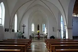 Das Kircheninnere zeigt einen dreijochigen Saal mit einem Stuckrippen-Kreuzgewölbe, ein Holzempore auf Pfeilern, einen spitzbogigen Triumphbogen und einen einjochigen Chor mit einem Fünfachtelschluss. Durch eine Öffnung der nordöstlichen Langhausmauer besteht eine Anbindung des hellen Erweiterungsbaus mit einer offenen Dachkonstruktion.