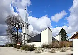 Die Kirche ist ein würfelförmiger Bau unter einem hohen dominierenden Zeltdach. An den Ecken sind vier Lichttürme aus Sichtbeton. Darüber sind Pultdächer aus Glasbausteinen. Der östlich liegende Kirchturm aus dem 19. Jahrhundert weist rundbogige Schallfenster auf und ist durch ein Zeltdach gedeckt. Dieser ist durch einen niedrigen Trakt mit dem Neubau verbunden.