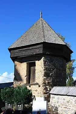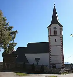 Die Kirche ist ein spätgotischer, wahrscheinlich um 1490 errichteter Bau mit eingezogenem Chor. Am von einem zweistufigen Strebepfeiler gestützten Chor ist nördlich eine Sakristei angebaut. Der mächtige westliche Vorhallenturm hat die volle Breite des Langhauses und ist an der Westseite mit der Wehrmauer verbunden. Der Turm besitzt zweiteilige spitzbogige Schallfenster und wird von einem achtseitigen Spitzhelm bekrönt. Einfach profilierte Seitenportale führen in die Turmvorhalle.