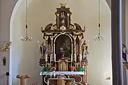 Der neobarocke Ädikulaaltar zeigt das Altarbild der Heiligen Johannes und Paulus flankiert von den Figuren der Heiligen Augustinus und Norbert, der Aufsatz trägt die Figur Madonna in Formen um 1700. In der Seitenkapelle steht ein neobarocker Lourdesaltar.