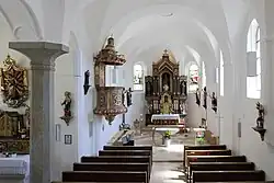 Die Altäre haben neuromanische Formen. Der Hochaltar aus 1886 trägt mittig die Statue hl. Pankratius mit den Seitenfiguren der Heiligen Agnes und Cäcilia. Die barocke Kanzel wurde 1788 oder 1807 vom Sighartinger Schreiner Matthias Rosenstingl geschaffen. Der Marienaltar der Marienkapelle wurde in seiner heutigen Form im Jahre 1961 errichtet und trägt eine Immaculatastatue, einen Tabernakel und zwei flankierenden Engel.