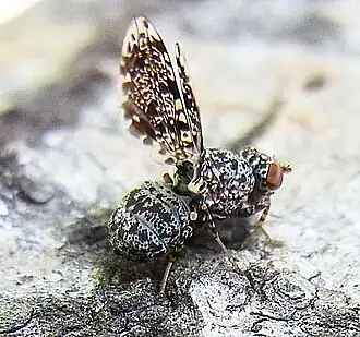 Die Brust ist länger als breit. Die ovalen Flügel sind 2,1-mal so lang wie breit. Die Flügelader Radius 1 ist kurz beborstet, im mittleren Bereich (Diskalzellen) sind die Flügel mit zahlreichen kleinen dunklen und transparenten Flecken besetzt, im Bereich des Vorderrandes treten größere Flecken auf. Die Flecken sind locker verteilt und bilden keine Querbänder. Die graue und durchgehend matte Oberseite der Brust ist mit mikroskopisch kleinen schwarzen Haaren bedeckt.[3]