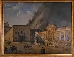 Die Pferdefresken in den Wandfeldern der Schauwand im Hintergrund schuf Franz Anton Ebner, diese wurden mehrfach übermalt, zuletzt 1960. 1860 wurden wegen des zunehmenden Verkehrs das linke Tor zum Neutor und zwei Wandfelder abgetragen.