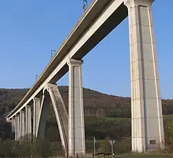 Die rechteckigen maximal 53 m hohen Stahlbetonpfeiler haben einen Hohlkastenquerschnitt mit 35 cm Wanddicke. Im Gegensatz zu den anderen Brücken der Strecke mit abgeschrägten Pfeilerecken sind diese durch betont verstärkte Pfeilerecken sowie eine geschwungene Form am Pfeilerkopf gestaltet. Das Mindestaußenmaß unterhalb der Pfeilerköpfe beträgt 5,3 m × 3,2 m. Ab dort verbreitern sich die Stützen mit einem Anzug von 60:1 in beide Richtungen nach unten.