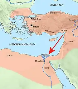 Nach dem Abschluss des Königsfriedens hatte Artaxerxes II. die Hände frei, um gegen das damals von König Hakoris regierte aufständische Ägypten und den mit Hakoris verbündeten zyprischen König Euagoras I. vorzugehen. Der attische Stratege Chabrias blieb aber als Privatmann als Söldnerführer in ägyptischen Diensten.[66] Nun wurde Pharnabazos zusammen mit den Feldherren Tithraustes und Abrokomas die Eroberung Ägyptens anvertraut. Zur Erreichung dieses Ziels zogen die drei Heerführer in Syrien ein starkes Heer zusammen und marschierten damit gegen Ägypten. Aber obwohl auf Pharnabazos’ Druck hin Chabrias wahrscheinlich während dieses Kriegs in seine Heimat abberufen wurde,[67] musste der wohl von etwa 385 bis 383 v. Chr. geführte dreijährige Feldzug einstweilen ergebnislos beendet werden, da die Ägypter hervorragend gerüstet waren.[68]