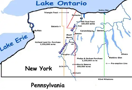 Morris verkaufte dann das meiste dieses Landes im Dezember 1792 sowie im Februar und Juli 1793 an die Holland Land Company (bekannt als „The Holland Purchase“). Allerdings behielt er für sich selbst 500.000 Acres (2.000 km², 780 Quadratmeilen) in einem 12 Meilen breiten Streifen entlang der Ostseite des Landes, was von Massachusetts akquiriert wurde, von der Pennsylvania Grenze zu Lake Ontario, bekannt als "The Morris Reserve". Das Nordende von der Morris Reserve, ein 87.000 Acres (350 km², 136 Quadratmeilen) dreieckiggeformtes Gebiet ("The Triangle Tract"), wurde von Morris an Herman Leroy, William Bayard und John McEvers verkauft, während ein 100.000 Acres (400 km², 160 Quadratmeilen) großer Gebietsteil westlich des Triangle Tract an den Staat Connecticut ging. Im September 1797 löschte Morris den restlichen Indianeranspruch für das ganze Land westlich vom Genesee durch den "Vertrag von Big Tree" (Geneseo).