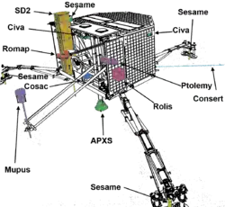 - SESAME (Surface Electric Sounding and Acoustic Monitoring Experiment).[16] SESAME besteht aus drei Teilen: CASSE (Cometary Acoustic Surface Sounding Experiment) bestimmt über die Analyse der Schallausbreitung im Kometenboden die Struktur des Materials. DIM (Dust Impact Monitor) misst dreidimensional aufgelöst den Staubfluss in der Umgebung des Landers. PP (Permittivity Probe) sondiert den Untergrund elektrisch.[11]