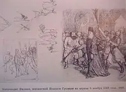 Das Thema seiner letzten Augenblicke wurde verschiedentlich künstlerisch aufgegriffen, so von den Malern Alexander Nikanorowitsch Nowoskolzew[1] (1853–1919) und Nikolai Wassiljewitsch Newrew[2] (1830–1904). Eine auf das Jahr 1866 datierte Zeichnung von Ilja Repin zeigt den Metropoliten Philipp, „der am 8. November 1568 von Iwan dem Schrecklichen aus der Kirche vertrieben wurde“.