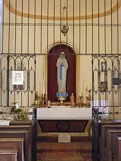 Das Innere ist folgendermaßen gestaltet: „Über dem Schiff und dem einspringenden rundbigigen Abschluss flachbogiges Gewölbe. Vor der Apsis schmiedeeisernes Gitter. Fußboden aus quadratischen, roten und weißen Marmorplatten.“[3] Zur Einrichtung gehörte ursprünglich eine nicht mehr dort befindliche Holzstatue des gegeißelten Heilandes; die heutige Marienstatue in der Kapelle stammt von 1960.