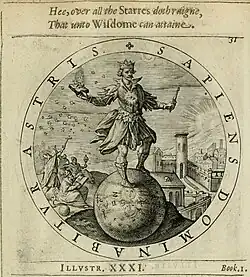 Weisheitsemblem (1635), Ausschnitt: SAPIENS DOMINABITUR ASTRIS. Der Text lautet frei übersetzt: „Wer wahre Weisheit erlangt, wird Herrscher über alle Gestirne sein.“