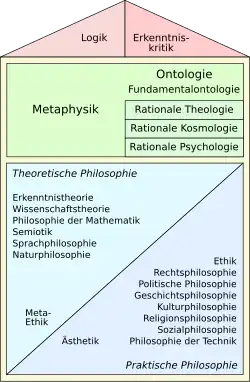 Klassischerweise werden der theoretischen Philosophie Logik, Metaphysik und Ontologie, Erkenntnis- und Wissenschaftstheorie, aber auch mathematische und Naturphilosophie zugerechnet. Vor allem die ersten drei beanspruchen Priorität als oberste philosophische Grundlagendisziplin. Zur praktischen Philosophie werden Ethik, Rechtsphilosophie, politische Philosophie, Handlungstheorie, Wirtschaftsphilosophie und Sozialphilosophie gezählt.