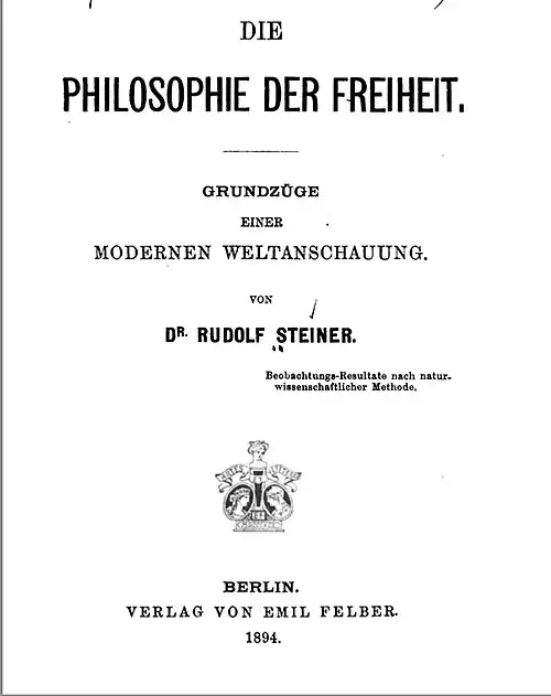 Steiner schloss mit seinem Buch inhaltlich an seine zwei Jahre zuvor eingereichte Dissertation an. Die Philosophie der Freiheit. Grundzüge einer modernen Weltanschauung. — Beobachtungsresultate nach naturwissenschaftlicher Methode entstand, wie die meisten Bände seiner zeitgleichen Goetheausgaben, unter starkem Zeitdruck. Für eine sorgfältige Durcharbeitung des Manuskripts, Konzepts und zum Korrekturlesen fehlte ihm die Zeit. Steiner konnte die seinem Verleger Emil Felber genannten Termine wiederholt nicht einhalten. Wegen seiner Säumigkeit drohte Felber den schon laufenden Druck zu stoppen. Felber lagen bereits die ersten Druckfahnen vor, während Steiner noch am Schluss des Buches schrieb, das dann am 14. November 1893 erschien. Das Titelblatt verzeichnet die Jahreszahl 1894. Die Philosophie der Freiheit gliedert sich in drei Teile: eine Erkenntnistheorie, eine Ethik und einen Anhang mit dem Titel: Die letzten Fragen. Abgesehen von dem letzten Kapitel folgt sie damit dem Aufriss seiner Dissertation. In Steiners Sicht ist Die Philosophie der Freiheit ein erkenntnistheoretisches Grundlagenwerk.[3]