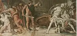Perseus versteinert den Phineus (rechts) mithilfe des Medusenhaupts. Fresko aus der Renaissance (Annibale Carracci und Domenichino, 1604–1606, Palazzo Farnese, Rom)