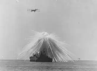Im Zweiten Weltkrieg kamen Anwendungen in der Luftwaffe hinzu. So setzte die britische Luftwaffe Phosphorbomben mit einem Gemisch aus weißem Phosphor und Kautschuk ein. Der Kautschuk dient hier als Passivierungsmittel, das die Brenndauer verlängert und den Preis senkt. Ähnlich wie Phosphor selbst schmilzt, klebt und brennt der Kautschuk und lässt sich schwer abstreifen. Phosphor verursacht auf der Haut schlecht heilende Wunden. Auch die britischen Pathfinder-Geschwader verwendeten zur Zielmarkierung Leucht- und Brandmunition mit weißem Phosphor. Ebenfalls in Großbritannien wurden Geräte entwickelt, die sich im Kontakt mit Wasser selbst entzünden, um eine Nebelfahne zu produzieren. Solche Seemarkierungen wurden von Aufklärungsflugzeugen abgeworfen, um die Position von U-Boot-Sichtungen oder Rettungsbooten zu kennzeichnen. Um den enthaltenen weißen Phosphor effizient zu verbrennen, enthält eine typische Mischung außerdem Calciumcarbid, das im Kontakt mit Wasser den Brennstoff Ethin erzeugt. Calciumphosphid dient als Zünder, denn mit Wasser reagiert es zu selbstentzündlichen Phosphanen. Kleinere Varianten dieser Geräte wurden verwendet, um Rettungsringe mit einer Nebelfahne zu versehen. Wird der Ring ins Wasser geworfen, entzündet sich der an einer Leine befestigte Nebelsatz und hilft so die verunglückte Person wieder aufzufinden. Diese Erfindung wurde vor der Umstellung auf elektrische Rettungslichter auch im zivilen Bereich eingesetzt.[39] Obwohl dieser Abschnitt überwiegend britische Beispiele nennt, wurde weißer Phosphor von allen Armeen verwendet. Moderne Nebelsätze und Leuchtspurmunition verwenden roten Phosphor. Aktuelle Leuchtsätze enthalten keinen Phosphor. Die letzte militärische Anwendung von weißem Phosphor ist das Legen von Bränden.