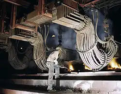 Gewonnen wird Phosphor aus Phosphatmineralien wie Phosphorit oder Apatit, indem diese in einem elektrischen Schmelz-Reduktionsofen zusammen mit Quarzkies auf 1500 °C erhitzt und so zu weißem Phosphor umgesetzt werden. Der Ofen ist als geschlossener Niederschachtofen ausgeführt, die Wärme wird über Söderberg-Elektroden zugeführt.[54]