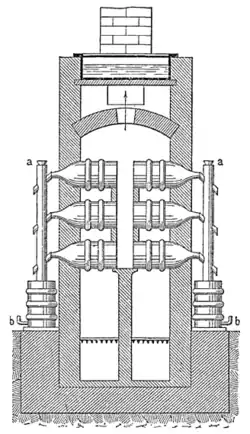Die erste Generation der Destillationsöfen wurde direkt mit Kohle befeuert. Das Werk der 1851 gegründeten englischen Firma Albright & Wilson wurde in Oldbury im Kohlerevier Black Country gebaut, da der Brennstoff hier besonders billig war. Ab etwa 1880 wurden die Kohleöfen durch regenerative Siemens-Öfen ersetzt, die mit Gas betrieben werden, das durch Kohlevergasung im betriebseigenen Gaswerk hergestellt wurde. Der Koks, ein Rückstand der Gasproduktion, wurde als Reduktionsmittel weiterverwendet. Bereits Ende der 1880er Jahre wurde das noch heute übliche elektro-thermische Verfahren eingeführt, das im Abschnitt Gewinnung und Darstellung beschrieben wird. Die verwendeten Schmelz-Reduktionsöfen erhitzen das Ausgangsmaterial ohne Umwege und sind daher sehr effizient. Außerdem muss die Destillation nicht mehr zum Befüllen der Retorten unterbrochen werden, denn dieser Ofen verwendet einen Tiegel, der kontinuierlich nachgefüllt werden kann. Der erneute Wechsel des Energieträgers von Gas zu elektrischem Strom erforderte weitere Umbauten. In Oldbury wurde das selbst produzierte Gas nun in Verbrennungsmotoren verfeuert, die elektrische Generatoren antrieben. Außerdem entstanden Phosphorfabriken an Standorten, an denen billig Strom produziert werden konnte, z. B. an den Niagarafällen.[31]
