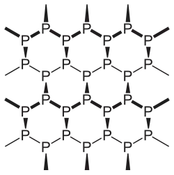 Die bei Zimmertemperatur stabilste Modifikation existiert in einer amorphen und drei kristallinen Formen. Schwarzer Phosphor ist aufgrund seiner polymeren Form unlöslich, deutlich schwerer entflammbar, sehr reaktionsträge und besitzt eine Dichte von 2,69 g/cm3. Daher ist der schwarze Phosphor ebenso wie der rote Phosphor ungiftig. Das dem schwarzen Phosphor zugrundeliegende Kristallgitter besteht aus gewellten Doppelschichten, in dem die Phosphoratome pyramidal mit drei weiteren in der Nachbarschaft befindlichen Phosphoratomen in einem Bindungswinkel von 100° verbunden sind. In dieser Konfiguration besitzt Phosphor Halbleitereigenschaften. In feuchter Luft wird schwarzer Phosphor etwas schneller oxidiert als roter Phosphor, überzieht sich dabei aber mit einer farblosen, viskosen Flüssigkeitshaut aus Phosphorsäuren, so dass der weitere Sauerstoffzutritt verhindert und eine Entzündung erschwert wird. Wenige Schichten von Schwarzem Phosphor können die Polarisation von Licht verändern.[69] Der normale schwarze Phosphor kristallisiert orthorhombisch; bei 80.000 Bar wandelt sich dieser reversibel in eine rhomboedrische und bei 110.000 Bar in eine kubische metallische Modifikation.