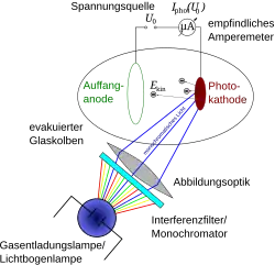Aus dem Licht einer Quecksilberdampflampe wird durch einen Interferenzfilter oder einen Monochromator ein schmaler Wellenlängenbereich gefiltert und (gegebenenfalls durch eine Linse) auf die Kathode (im Bild rot) einer Vakuum-Photozelle gebündelt. Vakuum ist erforderlich, damit die mittlere freie Weglänge der ausgetretenen Elektronen ausreicht, um die Anode zu erreichen. Eine Spannung kann zwischen den beiden Elektroden angelegt werden.[10][11]