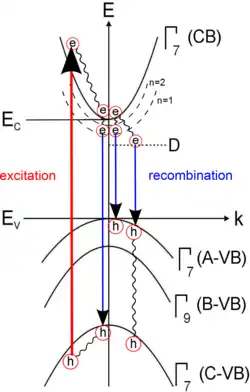 Bei der Photolumineszenz an Halbleitern werden durch Anregung mit Photonen mit Elektronen vom Valenzband ins Leitungsband gehoben. Diese angeregten Ladungsträger thermalisieren nichtstrahlend an die Bandkanten von Leitungs- und Valenzband über Abgabe der Energie an den Halbleiterkristall in Form von Phononen. Je nach Kristall rekombinieren diese freien Ladungsträger als Elektron-Loch-Paare, die sogenannten Exzitonen oder fallen in tiefer liegende Zustände und rekombinieren von dort. Es lassen sich mit der PL-Spektroskopie freie Exziton, an Störstellen gebundene Exzitonen, Donator-Akzeptor-Paare und weitere Zustände, die sich aus höher liegenden Niveaus des Exzitons (n=1, 2, ...) oder aus Kombinationen von Löchern aus unterschiedlichen Valenzbändern (A, B oder C) bilden, nachweisen. Als Störstellen kommen Donatoren, Akzeptoren und Kristalldefekte wie Versetzungen in Betracht. Diese Zustände rekombinieren dann mit charakteristischen Lebensdauern, welche einen Nachweis ermöglicht (z. B. über zeitaufgelöste Photolumineszenz-Spektroskopie (TRPL, engl.: time-resolved PL)). Die dabei frei werdende Energie kann in verschiedenen Formen abgegeben werden, zum Beispiel als Phononen über das Kristallgitter, als Photonen oder auch als Auger-Elektronen. Bei der Photolumineszenz werden die von strahlenden Rekombinationsmechanismen emittierten Photonen detektiert. Wenn mehrere angeregte Zustände existieren, können durch die sehr schnelle Thermalisierung im Allgemeinen nur Übergänge vom niedrigsten Zustand aus beobachtet werden. Die gemessene Strahlung erlaubt wichtige Einblicke in die Eigenschaften des untersuchten Stoffes, zum Beispiel in das Defektinventar des Kristalls und seine Bandlücke.