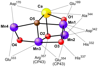 Die genaue Geometrie der Metallatome ist trotz intensiver Studien noch nicht ganz geklärt. Möglicherweise liegen die Metallatome mit Sauerstoffatomen wie in der Abbildung rechts vor und werden von verschiedenen Aminosäuren der D1- bzw. CP43-Untereinheit komplexiert.[33][38] Hierbei sind alle Manganatome von sechs Molekülen koordiniert und zwei Moleküle Wasser binden an Manganatom Nr. 4 (Mn4).