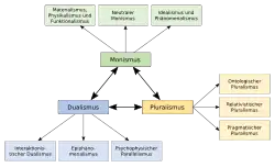 Pluralistische Positionen werden aus verschiedenen metaphysischen Perspektiven formuliert. Ein früher Vertreter des Pluralismus war Alfred North Whitehead, der diesen Gedanken in seinem philosophischen Hauptwerk Prozess und Realität entwickelte. Der Wissenschaftstheoretiker John Dupré[23] vertritt etwa einen realistischen Pluralismus, der eine pluralistische Ontologie impliziert. Nelson Goodman argumentiert hingegen für einen relativistischen Pluralismus,[24] der nicht mit einer pluralistischen Ontologie, sondern der Abschaffung ontologischer Konzepte einhergeht. Hilary Putnam versucht in Kombination mit dem internen Realismus eine Zwischenposition zu formulieren,[25] in Deutschland vertritt Peter Bieri neuerdings eine vergleichbare Position.[26]