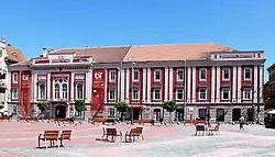 Auf dem Platz steht das Alte Rathaus (rumänisch Primăria Veche), das 1731–1734 nach den Plänen des italienischen Architekten Pietro del Bronzo auf den Grundmauern eines im Türkenkrieg zerstörten türkischen Bades[2] errichtet wurde, aber in den folgenden Jahrhunderten einige Änderungen erfuhr. Die Fassade ist eine Mischung aus Stilelementen des Barock und der Renaissance und beinhaltet mit dem Bild starker Türme in einer Festung das städtische Wappen. Hier ist auch der Sitz der Musik-Fakultät der Universität des Westens Timișoara.[3] In diesem östlichen Teil des Platzes befand sich auch die frühere Sparkasse, die 1855 von dem Architekten Karl Mai errichtet wurde,[4] sowie die Biblioteca Județeană George Barițiu (deutsch Kreisbibliothek George Barițiu).