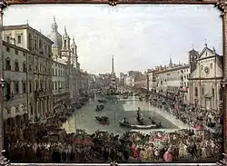 Zu allen Zeiten war die Piazza Navona ein beliebter Schauplatz für Messen, Märkte und Feste[7]. So die Giostra del Saracino, ein mittelalterliches Reiterturnier. Im 17. und 18. Jahrhundert vergnügten sich die Römer an den Samstagen im August bei den Inondate. Dafür ließ man die Brunnen überlaufen, so dass Jung und Alt im Wasser planschen und sich vergnügen konnte.[8]