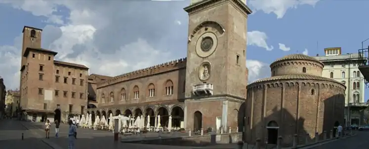Ein großes Stück Land an der Ostseite des Klosters Sant’Andrea wurde als Forum Boarium für den Viehmarkt genutzt. Nach der Verlegung des Viehmarktes an einen peripheren Ort wurde der Platz vor der Via di Sant’Andrea, der heutigen Via Broletto, auf dem bereits an Händler vermietete Läden errichtet worden waren, durch den Palazzo del Podestà (auch Palazzo del Broletto genannt) in zwei Teile geteilt und zum Verwaltungszentrum der Gemeinde umfunktioniert. An der Ostseite des Teils, der zur Piazza delle Erbe werden sollte, wurde der Palazzo della Ragione errichtet. Der entstehende Platz wurde bereits von der Rotonda di San Lorenzo überragt, einer Architektur, die von Mathilde von Canossa in Auftrag gegeben wurde und deren runde Struktur an die Heilig-Grab-Ädikula erinnert und damit seine Hilfsfunktion gegenüber dem Blut Christi, das in der nahe gelegenen Basilika Sant’Andrea (Mantua) aufbewahrt und verehrt wird, verstärkte.